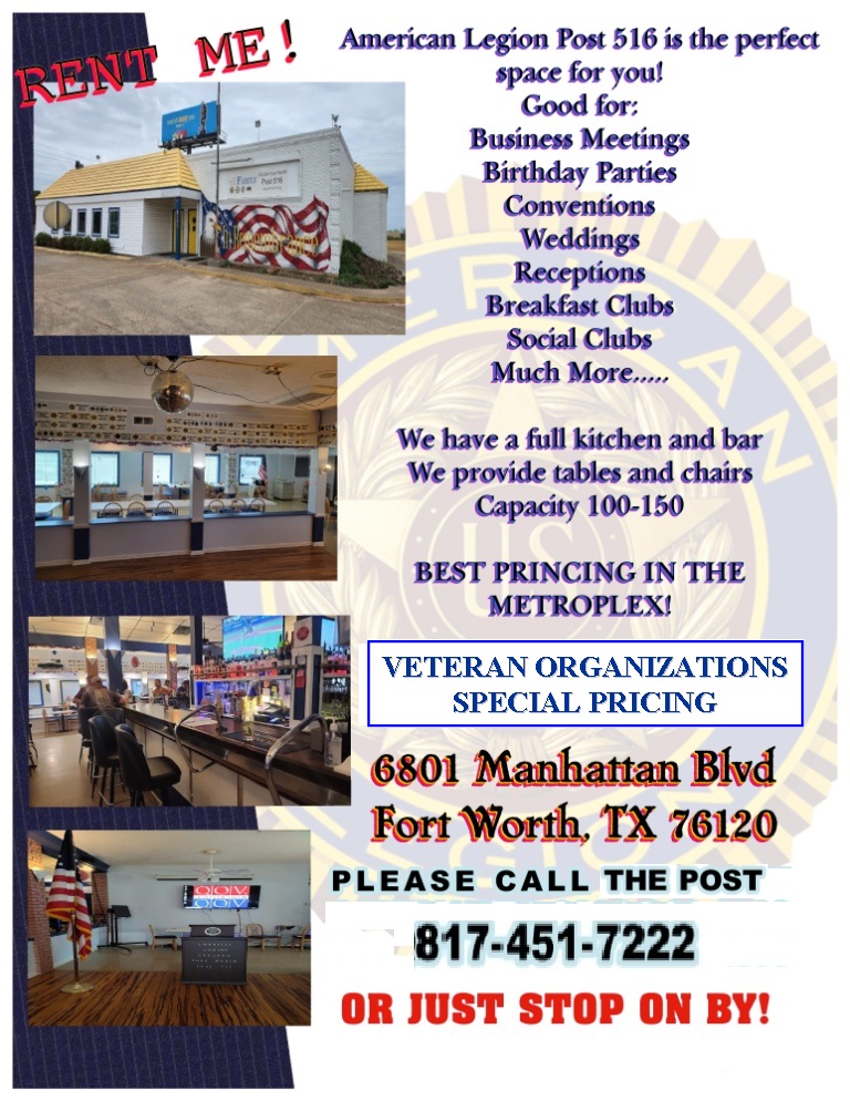 Our building is available for lease when not committed for veteran, community or legion activities.